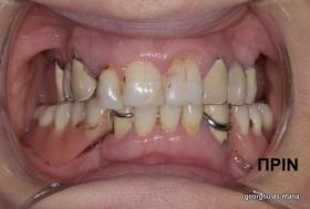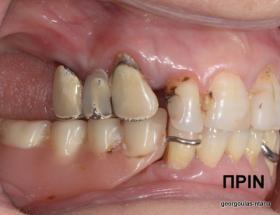 Η ασθενής αυτή είχε παλιές ακίνητες αποκαταστάσεις (γέφυρες) στην άνω γνάθο κ μια κινητή προσθετική αποκατάσταση (μερική οδοντοστοιχία-"μασελάκι") στην κάτω γνάθο. Ήταν δυσαρεστημένη τόσο με την εμφάνιση όσο και με τη λειτουργία των δοντιών της καθώς παραπονιόταν ότι είχαν εντονη κινητικότητα ενώ και οι προσθετικές τους εργασιές δεν ήταν σταθερές. Η πρόγνωση των δοντιών κρίθηκε φτωχή με αποτέλεσμα να μην είναι δυνατή η συμμετοχή τους σε μια νεα προσθετική αποκατάσταση με μακροχρόνια διάρκεια. Η ασθενής επιθυμούσε οι νέες αποκαταστάσεις να είναι σταθερές και ακίνητες. Για το λόγο αυτό αποφασίστηκε η ολική αποκατάσταση της άνω κ κάτω γνάθου με ακίνητες επιεμφυτευματικές εργασίες. Στην αριστερή πλευρά της άνω γνάθου, λόγω μη επαρκούς οστού για την τοποθέτηση εμφυτευμάτων προηγήθηκε επέμβαση ανοιχτής ανύψωσης ιγμορείου άντρου με τη χρήση πιεζοχειρουργικού μηχανήματος ώστε να δημιουργηθεί το κατάλληλο οστικό υπόστρωμα. Ακολούθησε σε επόμενο χειρουργείο η εξαγωγή των υπάρχοντων δοντιών κ η άμεση τοποθέτηση εμφυτεύματων (άμεση εμφύτευση) κ δύο μέρες μετά η τοποθέτηση προσωρινής εργασίας επί των εμφυτευμάτων (άμεση φόρτιση) με αποτέλεσμα η ασθενής να μη μείνει καθόλου χωρίς δόντια κ να είναι καλυμένη αισθητικά όσο καιρό διήρκησε η εργασία