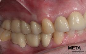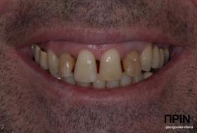 Ο ασθενής προσήλθε στο ιατρείο μας θέλοντας να βελτιώσει την εμφάνιση των πρόσθιων δοντιών του και να αποκαταστήσει την υγεία κ την λειτουργία όλου του στόματος. Πραγματοποιήθηκε περιοδοντική θεραπεία κ ενδοδοντικές θεραπείες (απονευρώσεις) όπου κρίθηκε απαραίτητο και στη συνέχεια τοποθετήθηκαν 3 εμφυτεύματα, 2 δεξιά στις θέσεις του πρώτου κ δεύτερου γομφίου κ 1 αριστερά στη θέση του πρώτου προγομφίου. Κατά την τοποθέτηση των 2 εμφυτευμάτων της δεξιάς πλευράς, πραγματοποιήθηκε κλειστή ανύψωση ιγμορείου με το σύστημα Piezotome-Intralift , τεχνική που εξασφαλίζει τη μικρότερη δυνατή επέμβαση κ τη μικρότερη μετεγχειρητική ταλαιπωρία (minimally invasive), καθώς κ αυξητικους παράγοντες PRF. Σε όλη τη διάρκεια της θεραπείας ο ασθενής ήταν καλυμμένος τόσο αισθητικά όσο και λειτουργικά με προσωρινές μεταβατικές αποκαταστάσεις. 4 μήνες μετά την τοποθέτηση των εμφυτευμάτων κ την οστεοενσωμάτωσή τους, ακολούθησε η τοποθέτηση των μόνιμων αποκαταστάσεων.