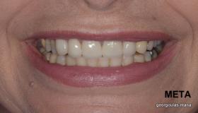 Η ασθενής αυτή είχε διαβρώσεις στα πρόσθια δόντια κ έντονες αποτριβές κυρίως στους κεντρικούς τομείς. Αποφασίστηκε να καλυφθούν τα 5 πρόσθια δόντια (κεντρικοί κ πλάγιοι τομείς δεξιά κ αριστερά κ δεξιός κυνόδοντας) με ολοκεραμικές στεφάνες από διπυριτικό λίθιο (Emax) ώστε να αποκατασταθεί τόσο η αισθητική όσο κ η λειτουργία της ασθενούς. Ο αριστερός κυνόδοντας επειδή αποτελούσε στήριγμα προϋπάρχουσας εργασίας δε συμπεριλήφθηκε στη νέα προσθετική αποκατάσταση.